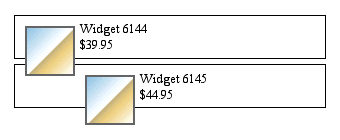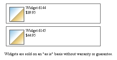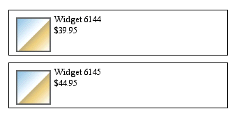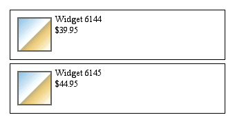 <div class="item"> <img src="w6144.gif"> Widget 6144 <br>$39.95 <hr> </div> <div class="item"> <img src="w6145.gif"> Widget 6145 <br>$44.95 <hr> </div>